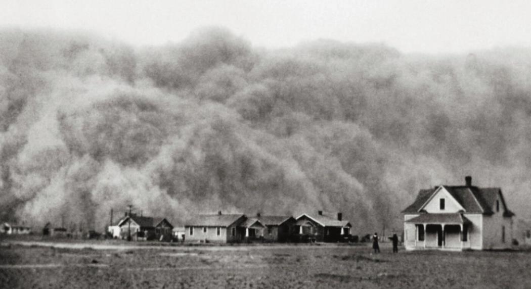 That year, a severe drought spread across the region. As crops died, wind began to carry dust from the over-plowed and over-grazed lands. The number of dust storms reported jumped from 14 in 1932 to 28 in 1933. The following year, the storms decreased in frequency but increased in intensity, culminating in the most severe storm yet in May 1934. Over a period of two days, high-level winds caught and carried some 350 million tons of silt all the way from the northern Great Plains to the eastern seaboard. According to The New York Times, dust “lodged itself in the eyes and throats of weeping and coughing New Yorkers,” and even ships some 300 miles offshore saw dust collect on their decks.