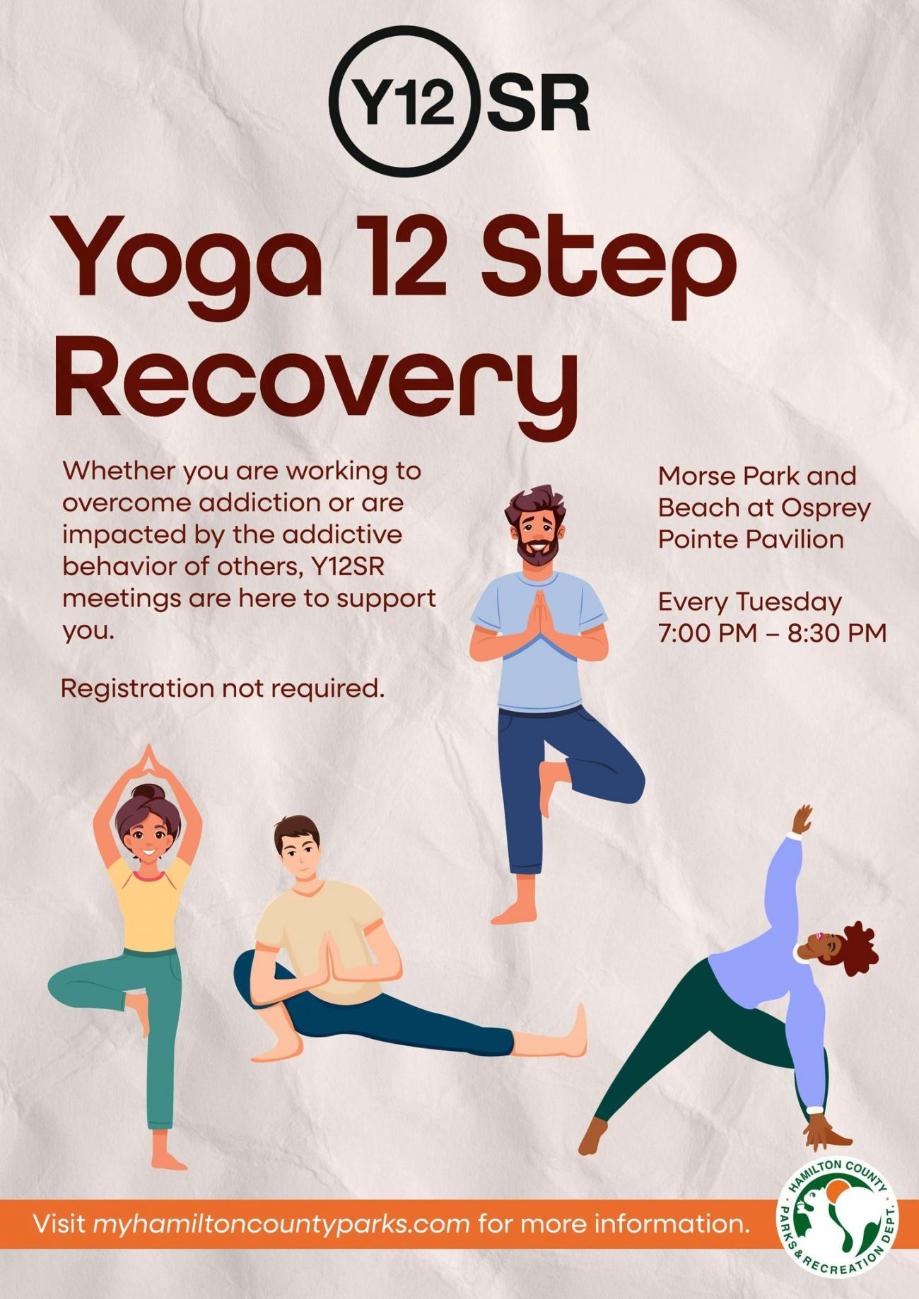 Hamilton County Parks and Recreation is honored to bring Y12SR to the community. Y12SR is a 12-step based discussion and yoga practice open to anyone and everyone dealing with their own addictive behavior or affected by the addictive behavior of others. This is an open and inclusive group. All are welcome!