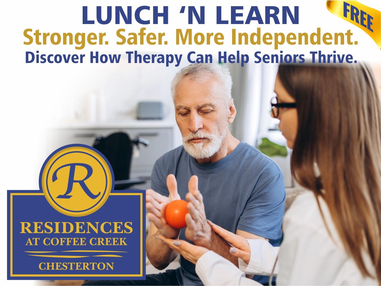 Outpatient Therapy helps older adults become stronger, safer, and more independent. Discover how therapy can help seniors thrive at a special presentation of LunchβN Learn Wednesday, April 29, 12-1:30 p.m. at Residences at Coffee Creek Senior Living, 2300 Village Point. Erin Harrington, Clinic director, EmpowerMe Wellness will explain how therapy makes a difference in strength, balance, and fall prevention, everyday living skills, communication and swallowing health, and recovery after illness or hospitalization. Complimentary light lunch will be served; RSVP Click for Details or (219) 921-5200.