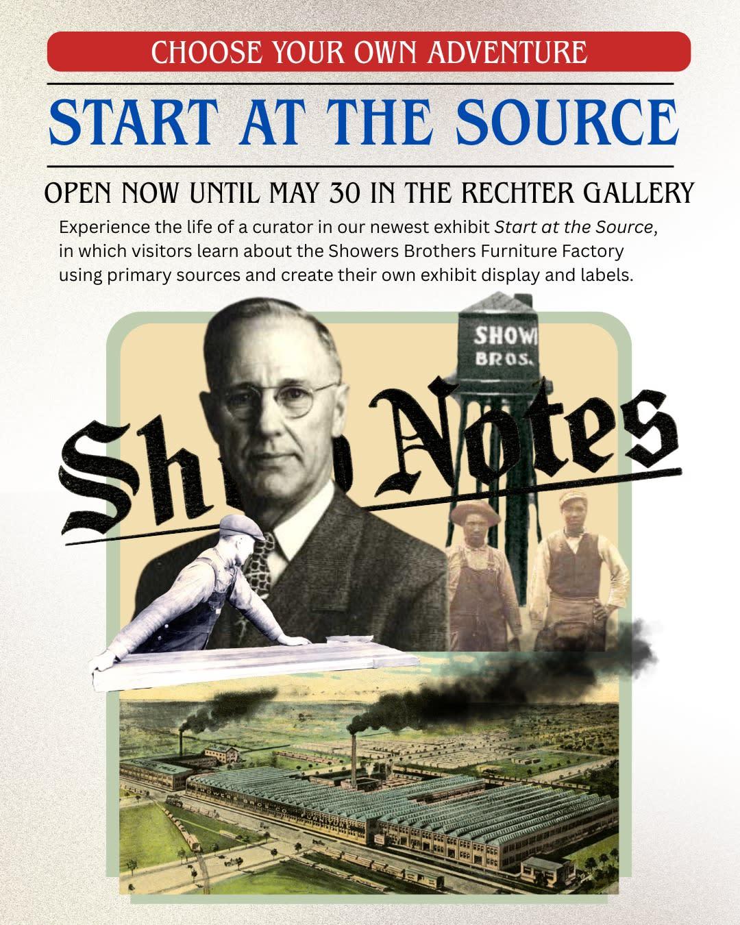 Start at the Source is an exhibit about how curators make exhibits and how we know historical information. This exhibit presents you with the primary and secondary sources about the Showers Brothers Furniture Factory, an important and thriving local business from 1868 to 1955. To move around the gallery, you are asked to “choose your own adventure,” where you get to decide the kind of information you want to learn about: the Showers family, the business and employees, or the products. At the end of your adventure, you can become the curator and create your own museum label.