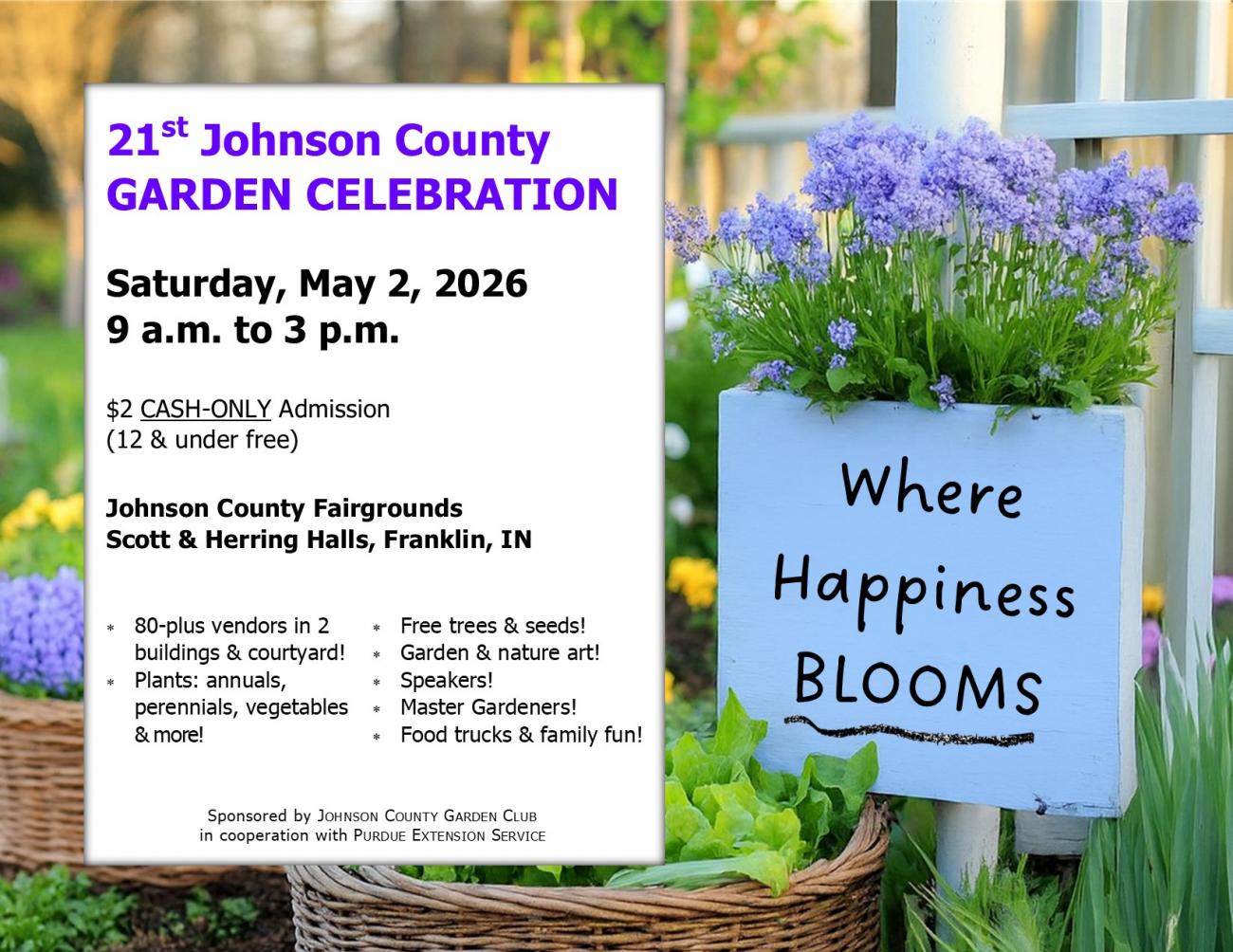 Happiness blooms before your eyes and in your heart at Johnson County’s Garden Celebration May 2 at the fairgrounds in Franklin. Gates open at 9 a.m., and festivities continue until 3 p.m. Buy annuals, perennials and vegetables, popular and unique plants, garden art, and cottage-farm products. Pick up some free seeds and tree seedlings while supplies last. Adults and children alike will be wowed with an up-close-and-personal, live wildlife rehabilitation presentation. More than 85 vendors plus Master Gardeners, Purdue Extension Service, food trucks and more. Still just $2 per person (CASH admission only, children 12 and under free) with free parking. Get your bloom on with a day of family fun!