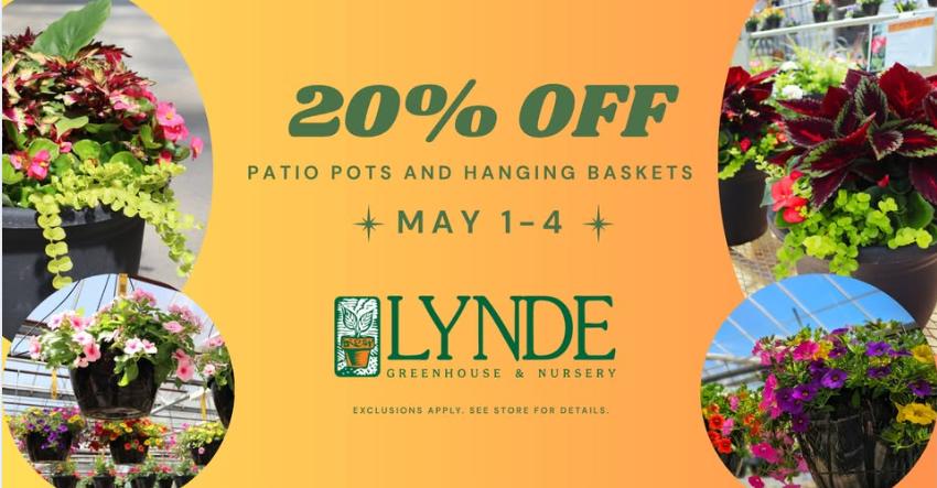 Brighten your days with fresh, vibrant blooms! Enjoy 20% off patio pots and hanging baskets—beautifully grown by Lynde Greenhouse.