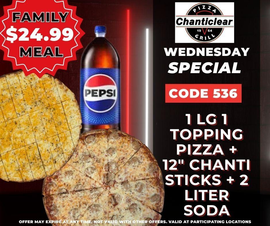 Get a Large 1-Topping pizza, 12-in. Chanti Sticks, and a 2-liter for $24.99 using code: 536. Order online: Click for Details