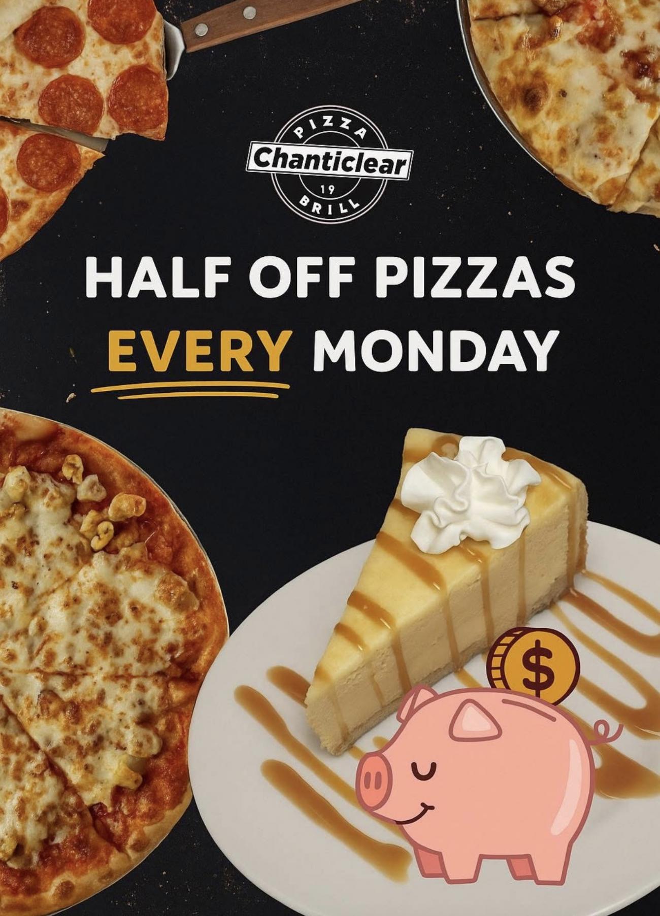 1/2 Price all pizzas Mondays when dining in only. Available open to close. Only valid at Maple Grove Location.