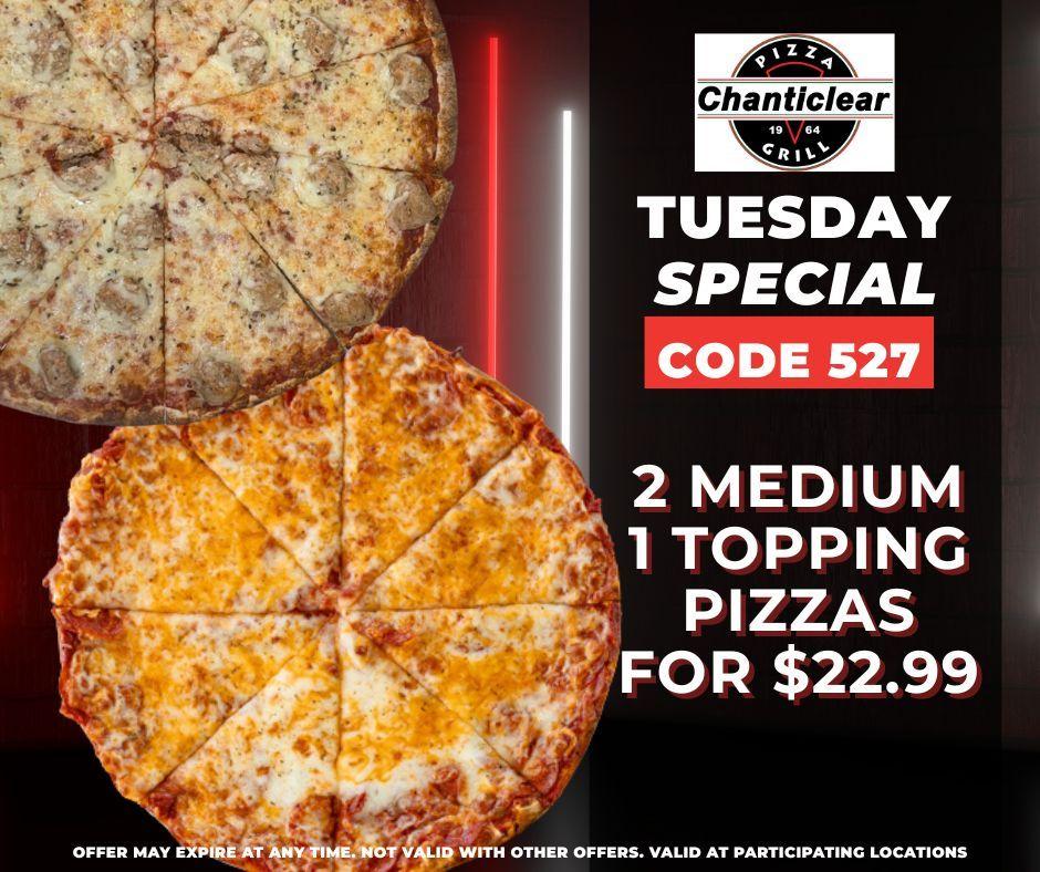 Every Tuesday get 2-Medium, 1-topping pizzas for $22.99 using code: 527. Order online: Click for Details