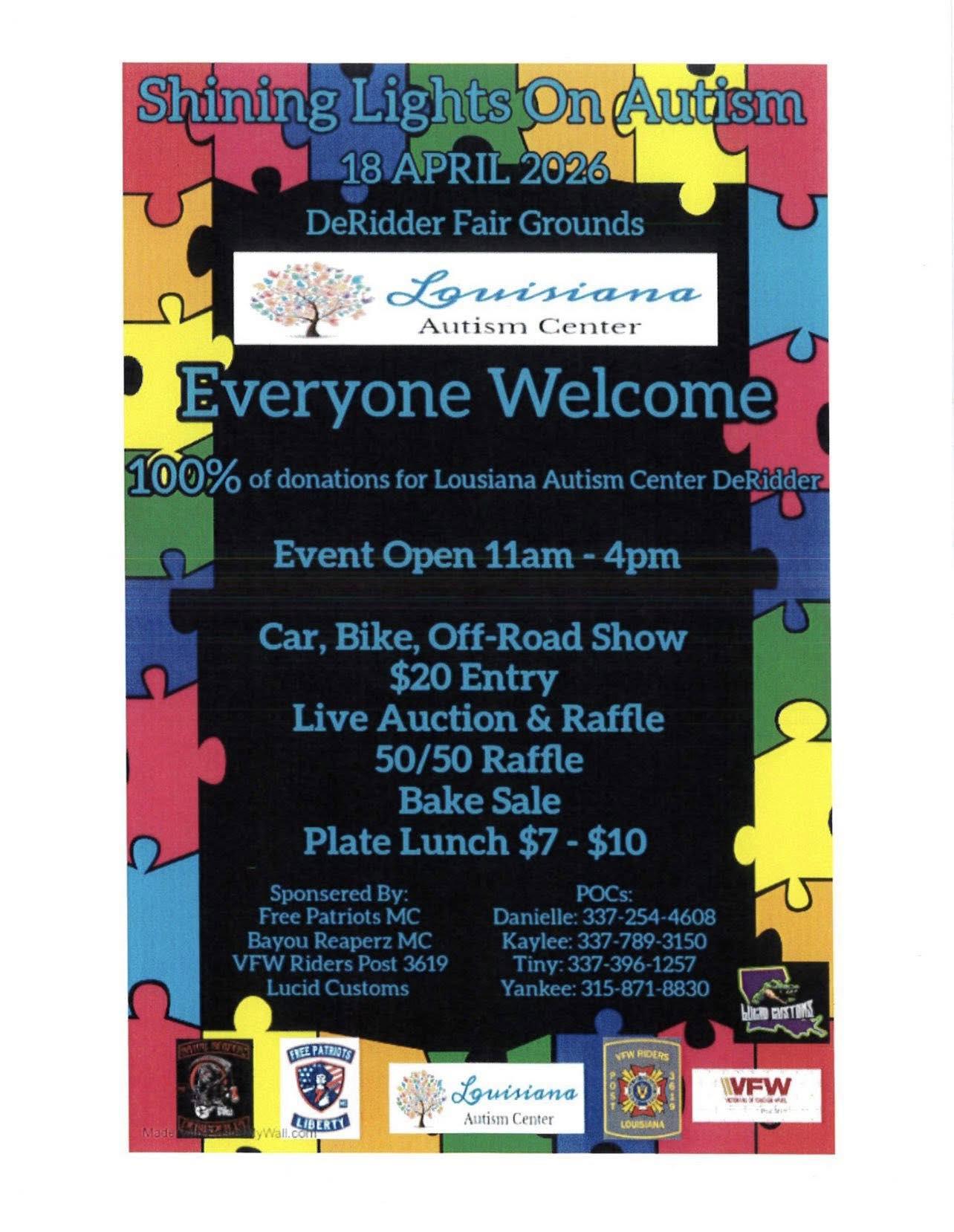 Join the community for Shining Lights on Autism on April 18, 2026, at the Beauregard Parish Fairgrounds. This family-friendly event supports the Louisiana Autism Center in DeRidder, with 100% of donations benefiting the center. The event runs 11:00 a.m. to 4:00 p.m. and features a car, bike, and off-road show, live auction, raffles, bake sale, and plate lunch. Everyone is welcome to attend and help support autism services in the community.