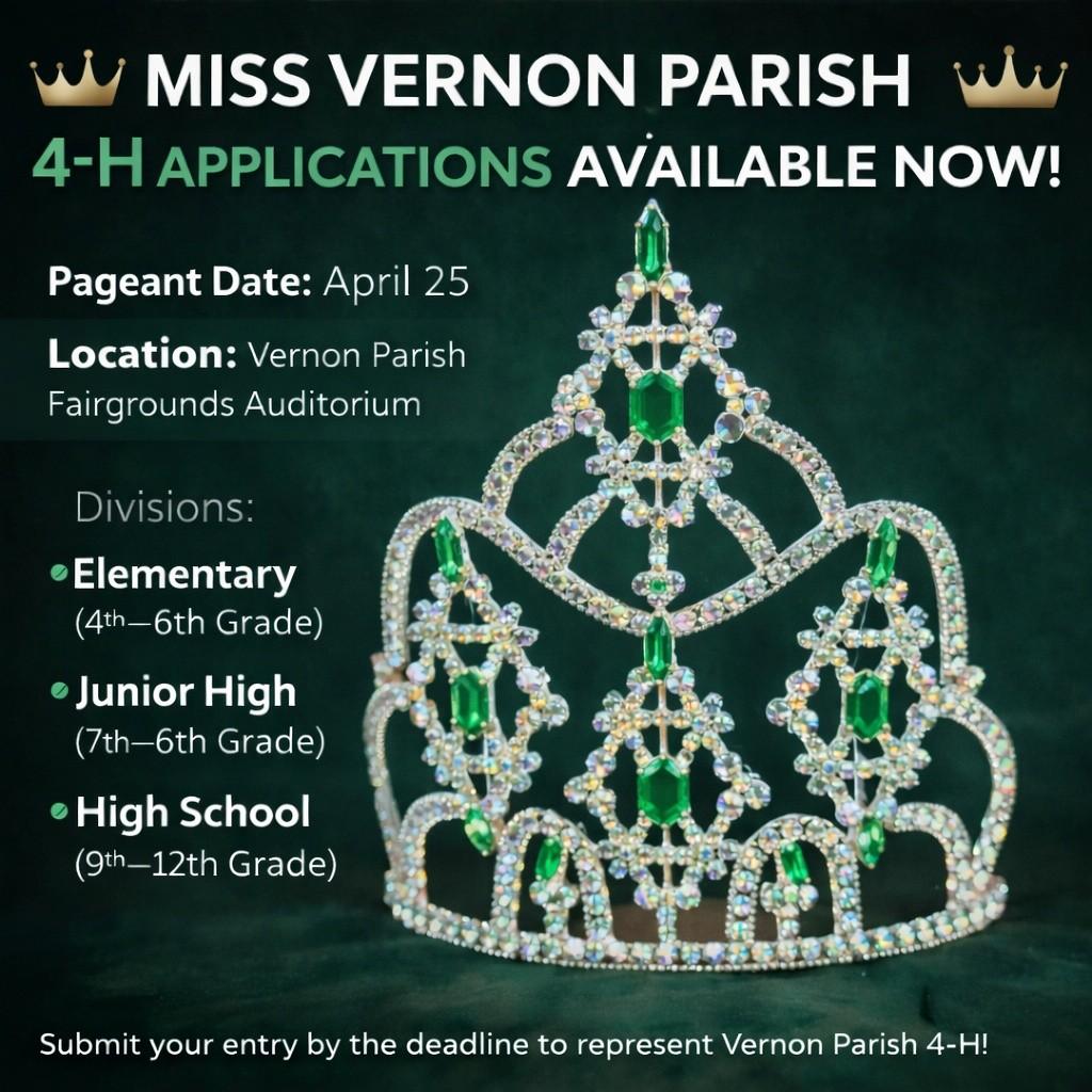Miss Vernon Parish 4-H Pageant – Entries are now open for the Miss Vernon Parish 4-H Pageant, taking place April 25 at the Vernon Parish Fairgrounds Auditorium. The pageant includes Elementary, Junior High, and High School divisions, and contestants will share how 4-H has impacted their lives while representing the 4-H values of Head, Heart, Hands, and Health. Winners will serve as ambassadors for Vernon Parish 4-H throughout the year.