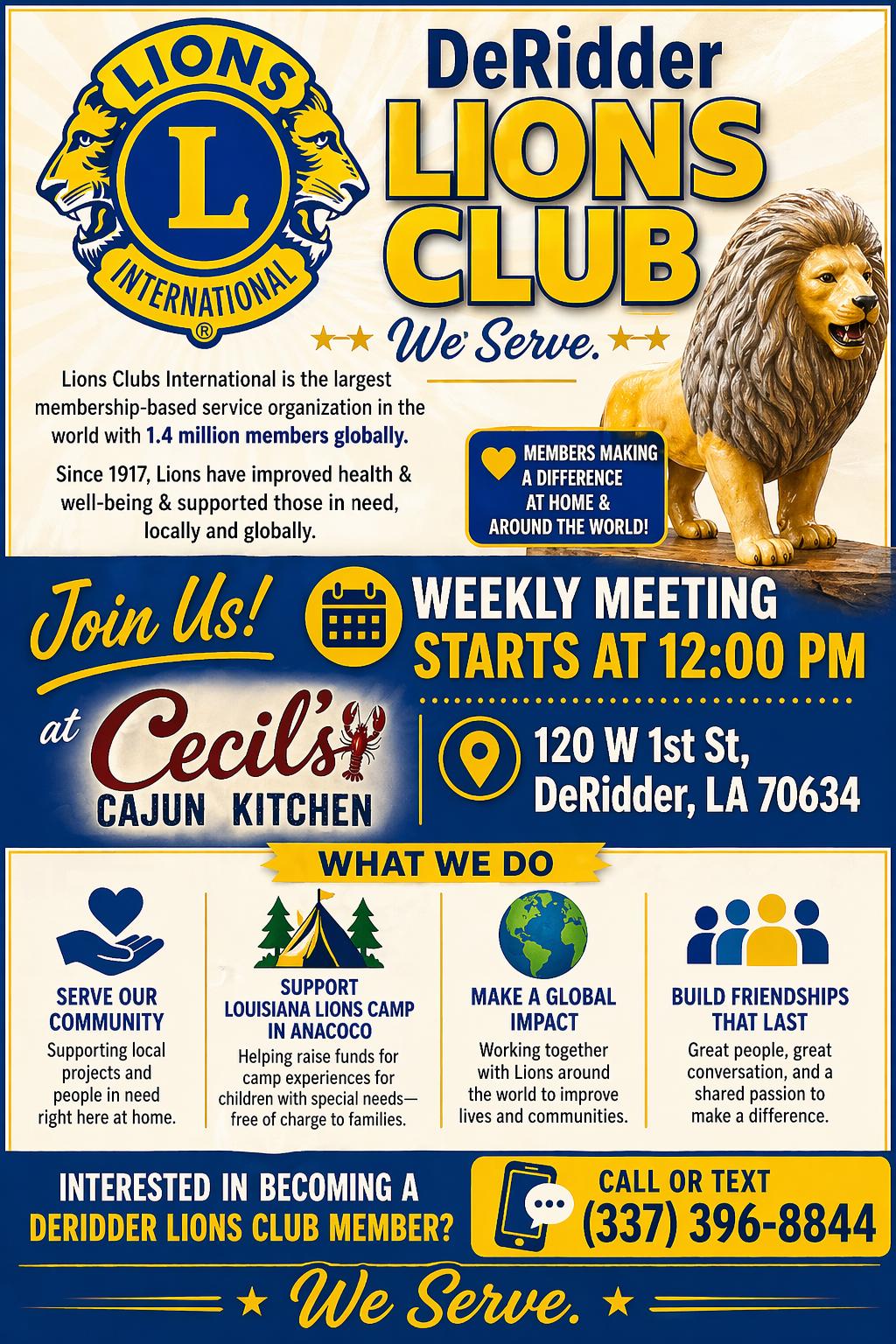 Join us each week for the DeRidder Lions Club Meeting at Cecil’s Cajun Kitchen! 🦁