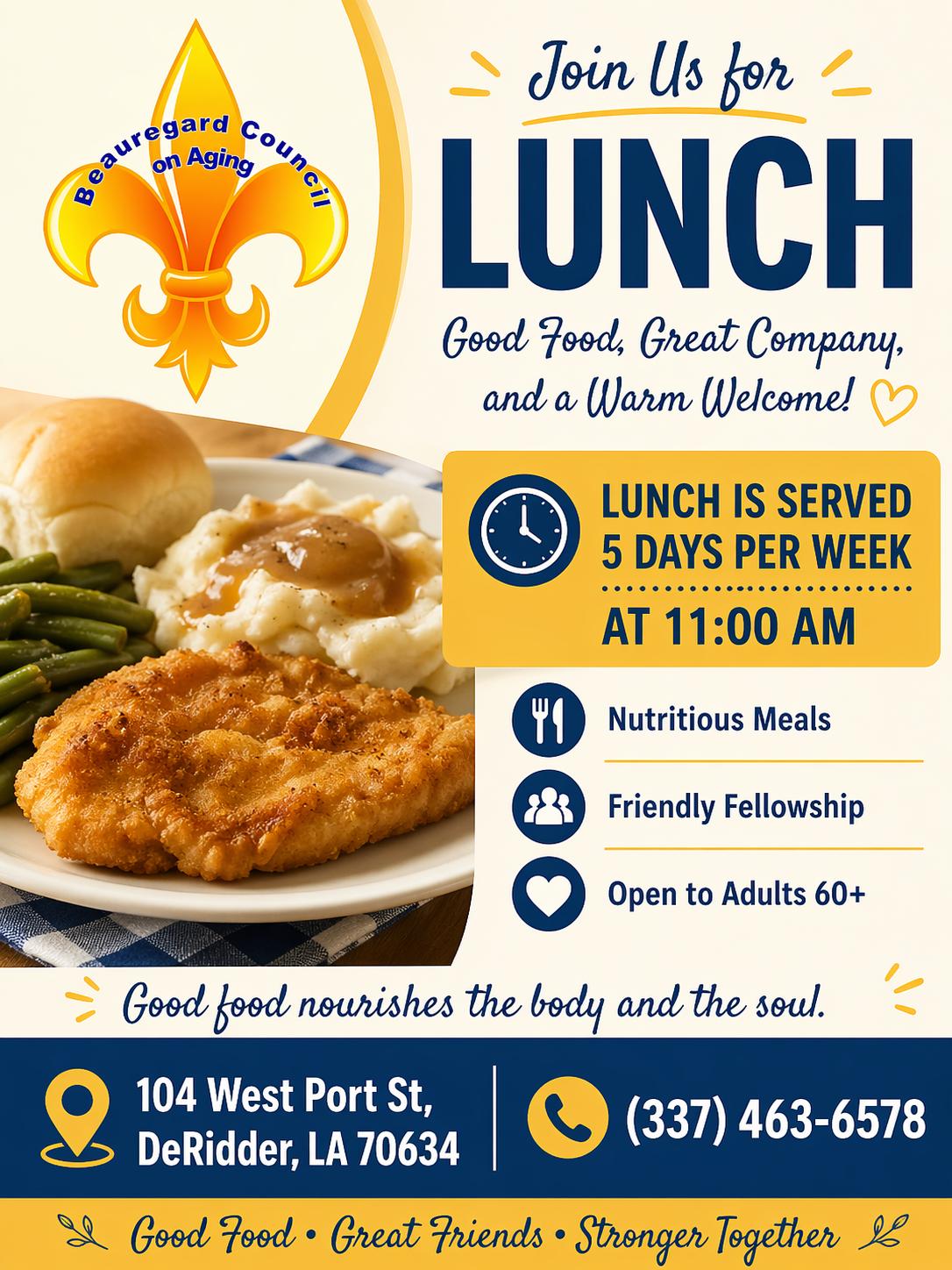 Free for seniors in Beauregard Parish 60 & older. Lunch begins at 11:00 AM.