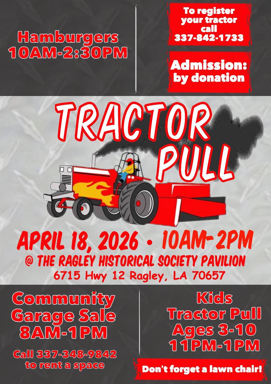 Bring the family, enjoy the excitement of the tractor pull, shop the garage sale, and grab a hamburger while supporting the community!