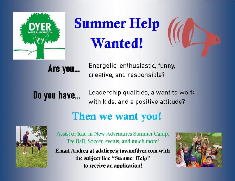 Email adaliege@townofdyer.com with subject line "Summer Help" if you would like an application or are interested in volunteering!