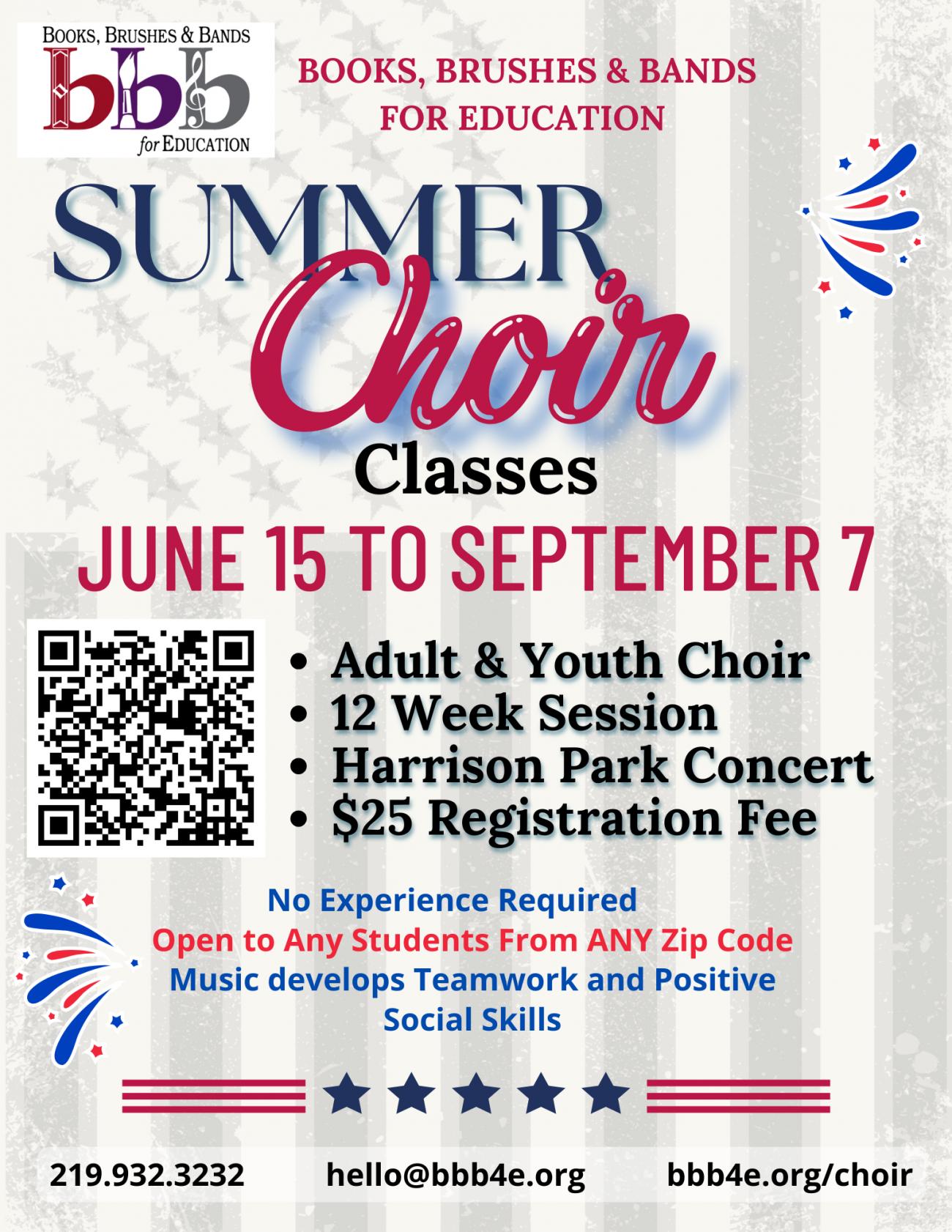 Books, Brushes & Bands for Education is presenting a rendition of the history of the USA and its rich culture called Americana. This will be a community choir combining ages 5 to 95 years old. Parents and children are encouraged to join together for our summer session!