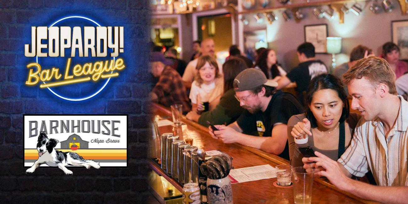 This is Jeopardy! Get ready for an epic trivia experience like no other with Jeopardy! Bar League. Geeks Who Drink is partnering with Sony Pictures Television and bringing America's Favorite Quiz Show® out of the studio and straight to your local bar. No more shouting at your TV: with Jeopardy! Bar League you get a thrilling, team-based experience with real clues from the Jeopardy! writers' room, all on your phone. Gather your smartest (or most entertaining) friends, form your team, and head to Barnhouse Napa Brews for Jeopardy! Bar League, every Tuesday at 7pm. And, for a limited time, you can rack up points toward a VIP trip to Los Angeles in our league championship! Top teams can win cash prizes, a Jeopardy! studio tour, or even a casting audition for the show! To learn more, visit jeopardybarleague.com.