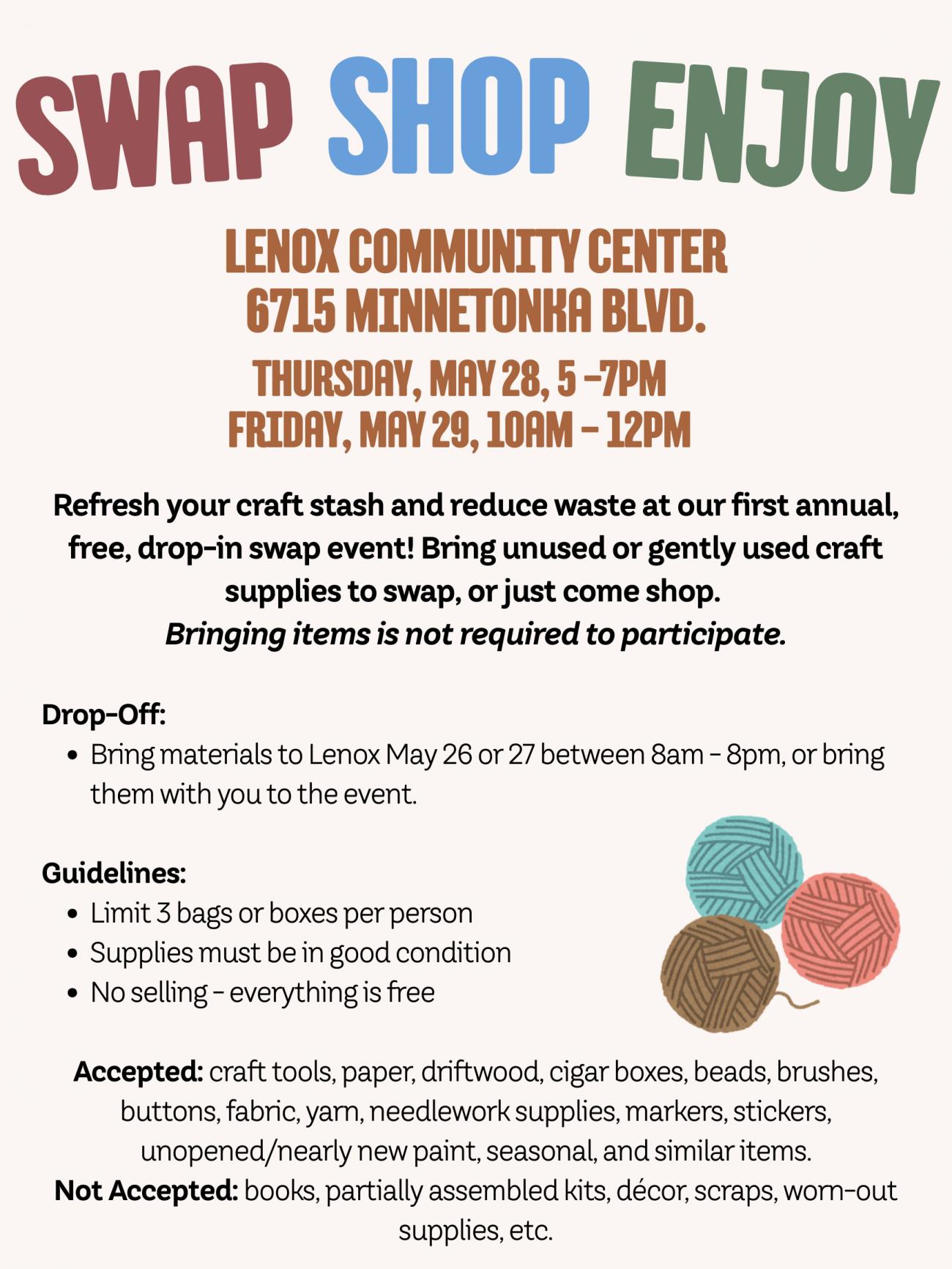 Join us at Lenox Community Center for our first annual, free, drop-in swap event! Refresh your craft stash and reduce waste by bringing unused or gently used craft supplies to swap, or just come shop.