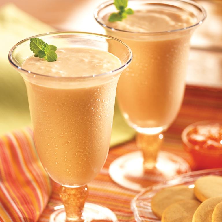 COMBINE all ingredients in a blender container and blend until smooth. Pour into two glasses and serve immediately.