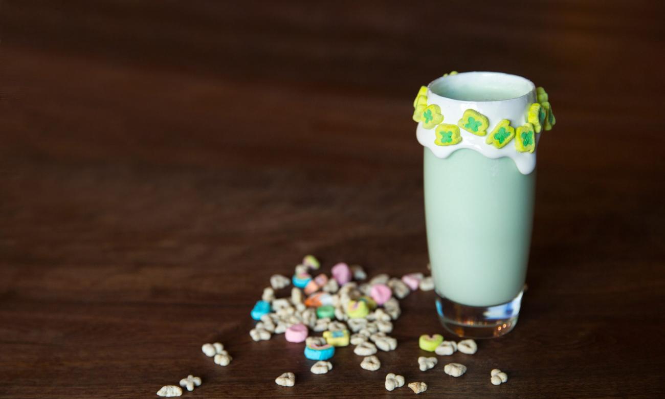 4 Place reserved cereal milk, vanilla-flavored yogurt, peppermint extract, honey, and green food coloring in a single-serve blender cup. Whirl until the mixture is smooth. Add a handful of ice and blend some more, if you prefer a cold shake.