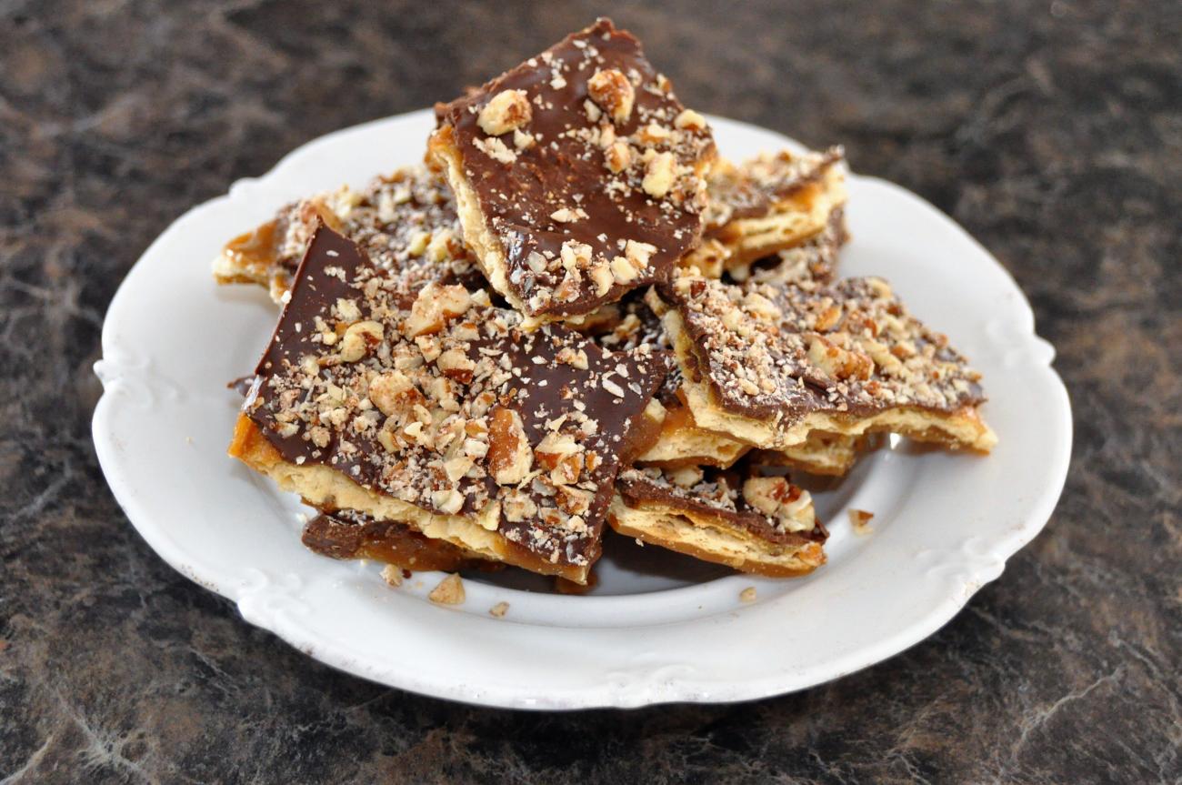 Bake at 400 degrees F (205 degrees C) for 5 to 6 minutes. Remove from oven and sprinkle chocolate chips over the top. Let sit for 5 minutes. Spread melted chocolate and top with chopped nuts. Cool completely and break into pieces.