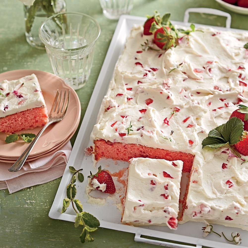 4 Bake at 350° for 30 to 40 minutes or until a wooden pick inserted in center comes out clean. Cool in pan on a wire rack 30 minutes. Lift cake from pan, using parchment paper sides as handles. Invert cake onto wire rack; gently remove parchment paper. Cool completely (about 1 hour). Spread Strawberry Frosting on top and sides of cake.
