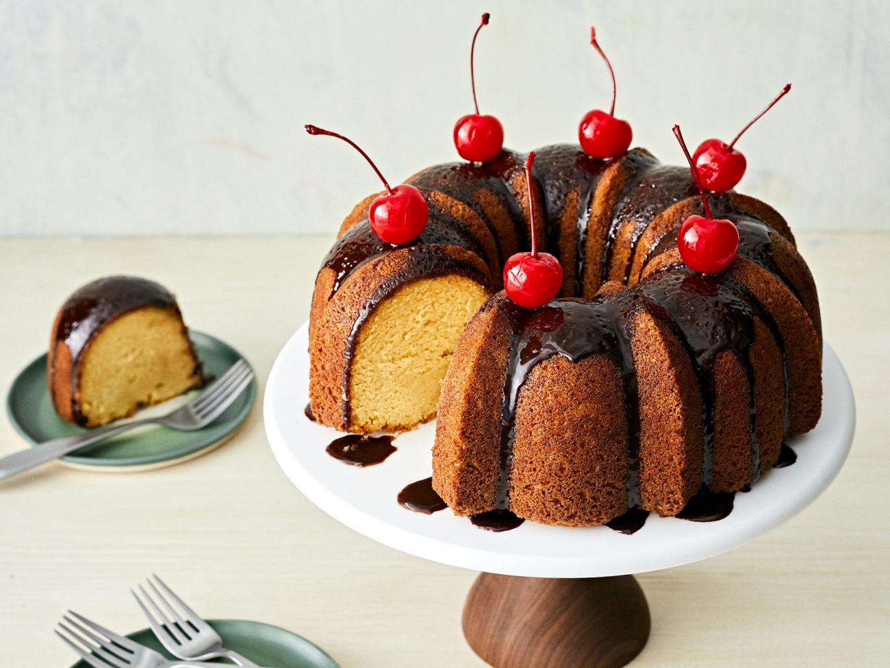 5 Prepare the Glaze: Place chocolate and butter in a 2-cup measuring cup. Heat cream in a small saucepan over medium until simmering. Pour cream over chocolate and butter, and let stand 1 minute; stir until smooth. Once cake is cooled completely, drizzle with chocolate glaze. Top with cherries, if desired.