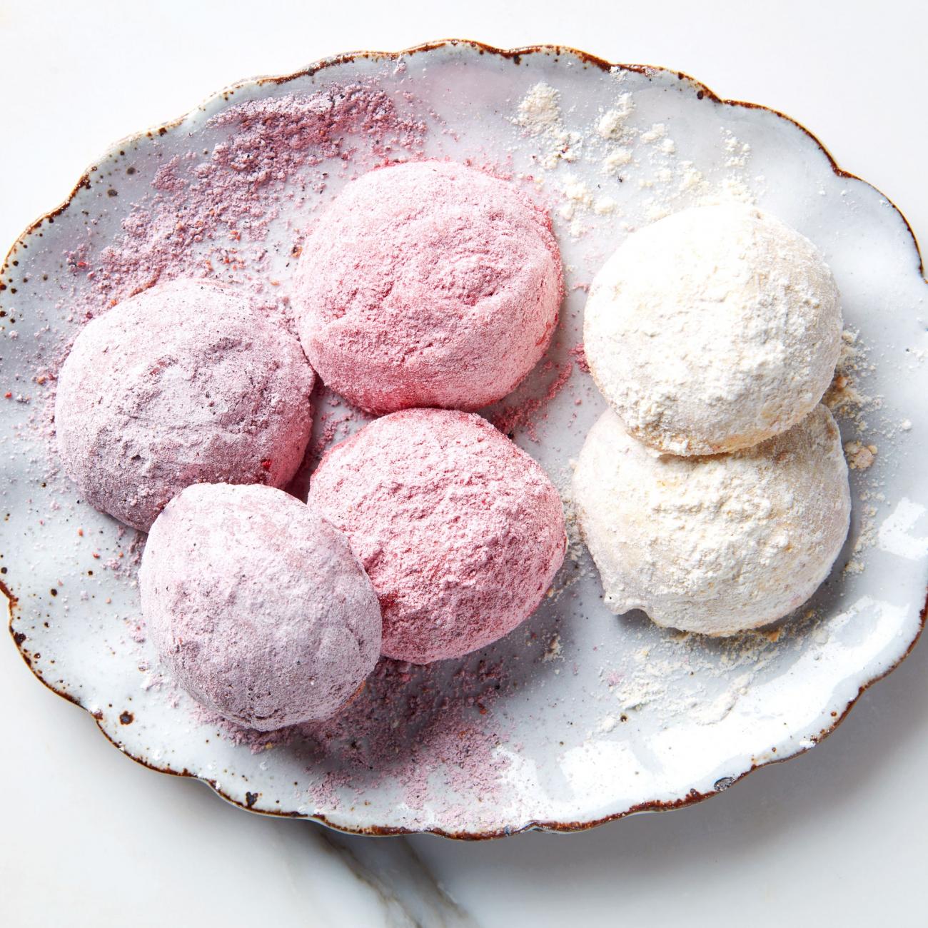 For each desired color, place 1/2 cup fruit with 1/2 cup confectioners’ sugar in the bowl of a food processor; process until smooth and evenly tinted. (Sugars can be stored in airtight containers up to 1 month.) Place tinted sugars in small bowls and dip cookies, domed side down, into tinted sugars to coat. Transfer to a plate and let rest, about 30 minutes. (Cookies can be stored in an airtight container at room temperature up to 1 week.)