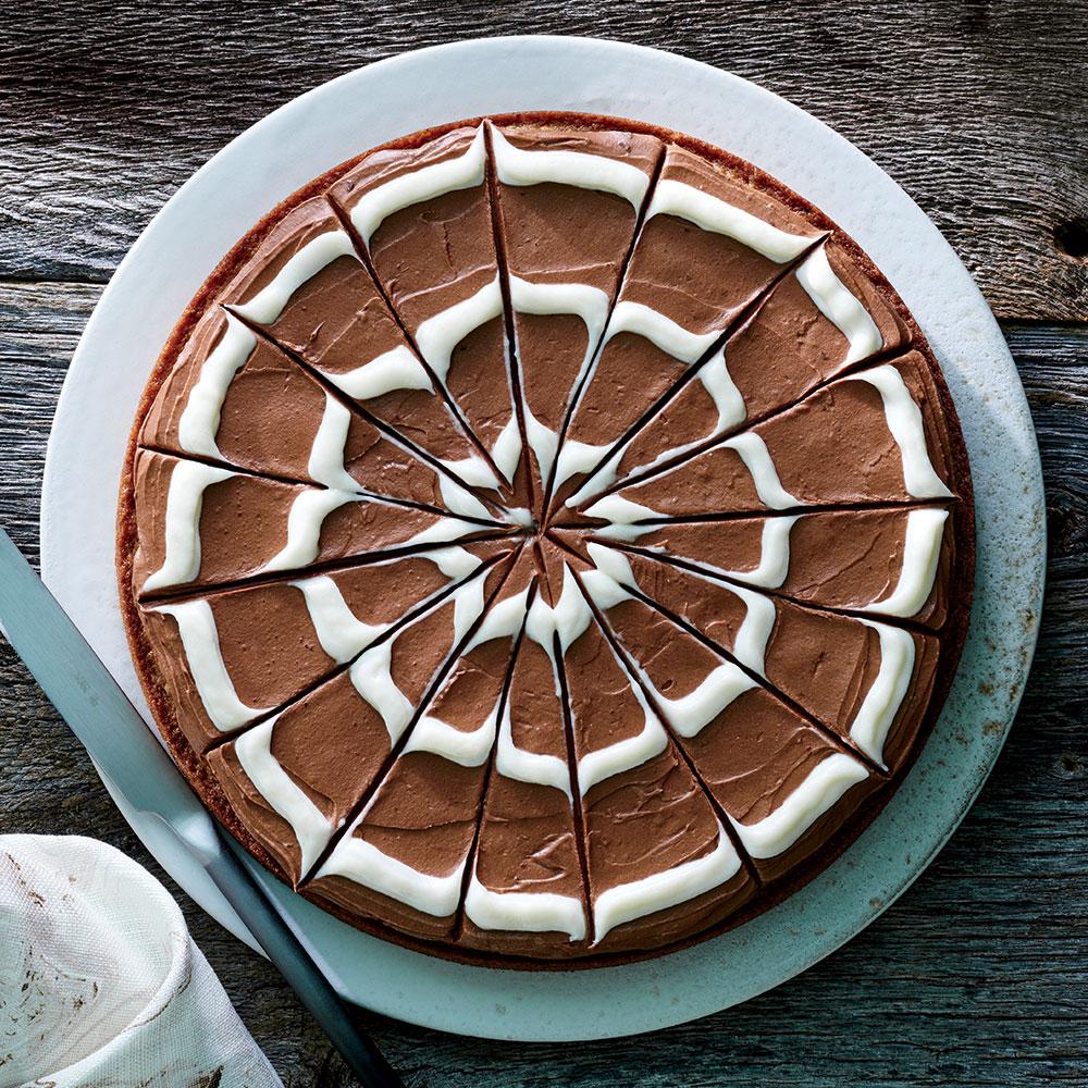 5 Place chocolate in a microwave-safe bowl; microwave at HIGH 30 seconds or just until melted, stirring occasionally. Stir melted chocolate into remaining cream cheese mixture. Pour chocolate mixture over blondies, spreading to an even layer. Snip a hole in 1 bottom corner of ziplock bag with cream cheese mixture. Pipe 3 concentric circles over blondies. Drag a wooden pick out from the center of the pan to the edge, repeating in a circle to create a web pattern. Cool.