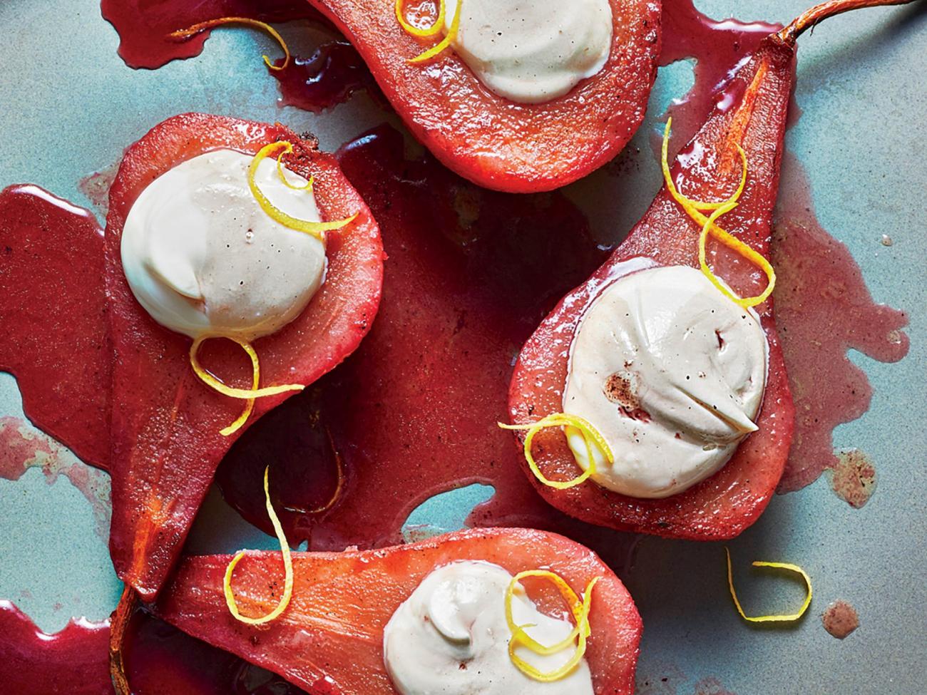 1 Peel, halve, and core three firm pears. Melt unsalted butter in a medium skillet over medium-high. Add pears, cut sides down; cook until browned, about 5 minutes. Add Pinot Noir, pomegranate juice, 1/4 cup maple syrup, vanilla extract, and cinnamon stick. Cover and simmer until tender, about 15 minutes. Let cool slightly. Stir together plain 2% reduced-fat Greek yogurt, crème fraîche, and 1 tsp. maple syrup in a small bowl. Spoon over pears; garnish with lemon zest.