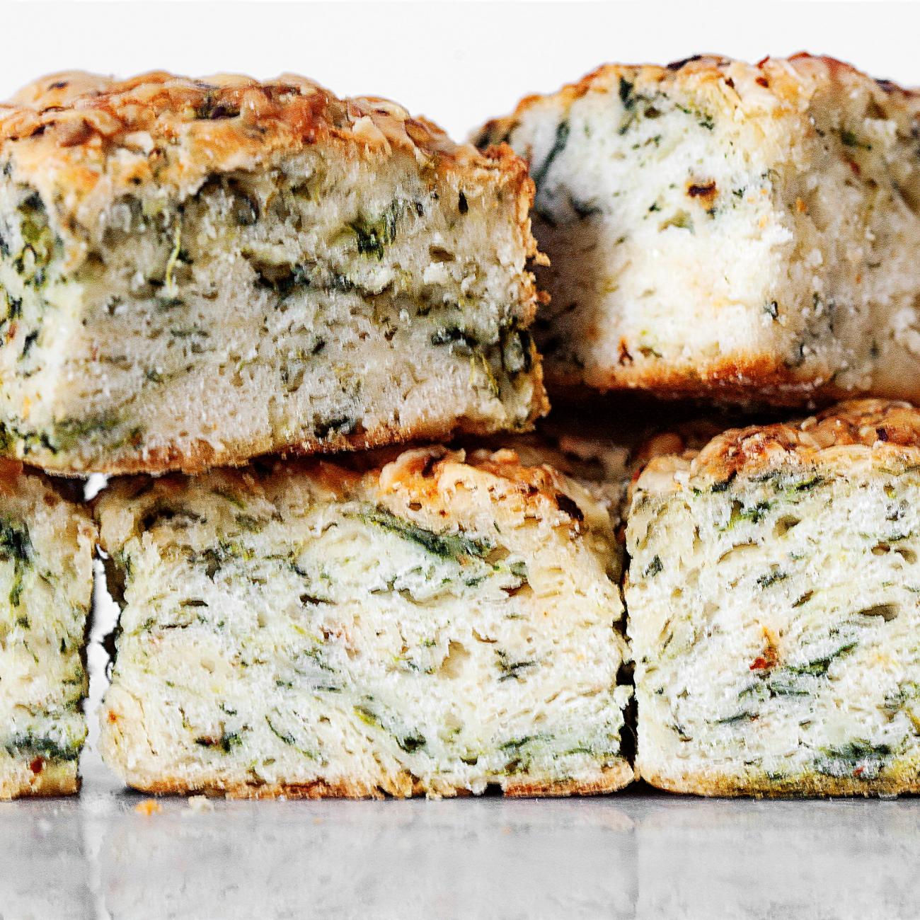 Scrape dough into prepared pan and press into an even layer. Using a bench scraper or knife, deeply score into 12 portions (cut down almost to pan beneath). Scatter reserved Gruyère and Parmesan over.
