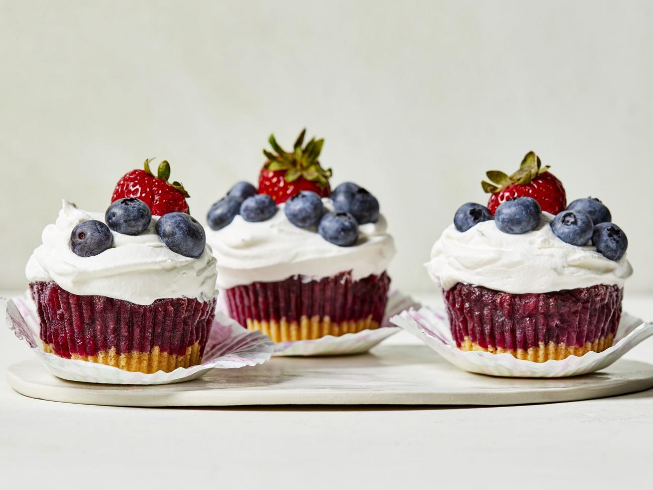 7 Remove sorbet “cupcakes” from freezer, and remove and discard paper muffin cups. Top “cupcakes” with whipped cream, and garnish with blueberries and halved strawberries. Serve immediately.