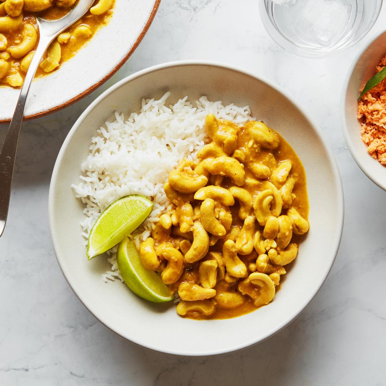 Add 1½ cups water to pot, scraping up any browned bits stuck to bottom with a wooden spoon. Stir in coconut milk and reserved cashews and bring just to a boil. Reduce heat so mixture is at a rapid simmer and cook, stirring occasionally and adjusting heat as needed, until cashews soften slightly and liquid is reduced by two thirds, 25–35 minutes. Remove from heat and let cashew curry sit 10 minutes (sauce will continue to thicken as it cools). Squeeze in lime juice; taste and season with more salt if needed.