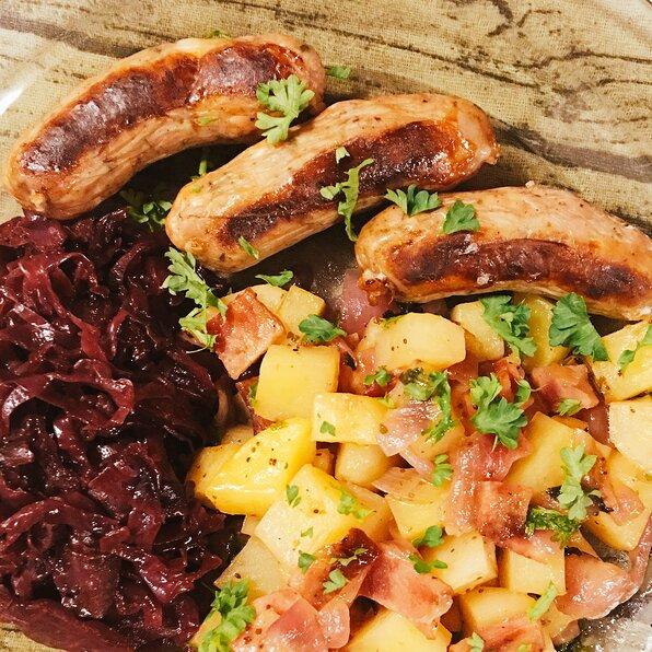 Add onion to the bacon grease and cook over medium heat until browned. Add the vinegar, water, sugar, salt and pepper to the pan. Bring to a boil, then add the potatoes and parsley. Crumble in half of the bacon. Heat through, then transfer to a serving dish. Crumble the remaining bacon over the top and serve warm.