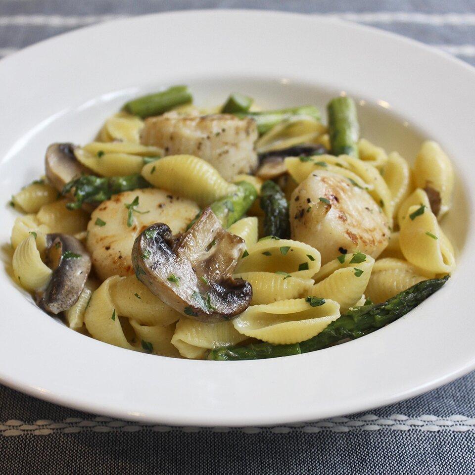 Meanwhile, in a small saucepan, combine the milk, mascarpone cheese and remaining butter. Cook over medium heat, stirring, until sauce is warm and butter is completely melted and blended in. Stir this sauce into the scallops and vegetables along with the pasta and serve immediately.
