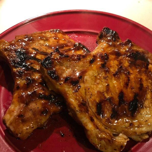 Sear the pork chops on both sides on the preheated grill. Lightly brush glaze onto each side of the chops as they cook; grill until no longer pink in the center, about 7 to 9 minutes per side. An instant-read thermometer inserted into the center should read 145 degrees F (63 degrees C).
