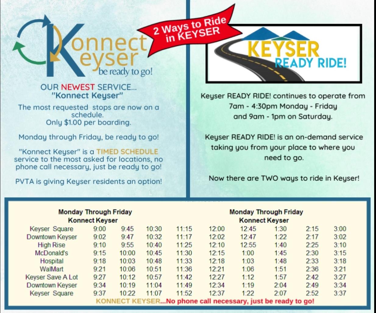 Don't let gas prices stop you from going where you need to go - hop on READY RIDE! in Keyser, Moorefield, Petersburg, or Romney for $1.50 each boarding. There's also Konnect Keyser, a fixed route service on a schedule to the most in demand locations in Keyser running from 9 - 3:30 Monday through Friday Click for Details