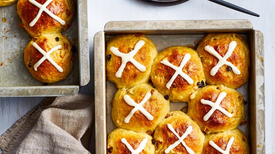 Cover loosely and let rise in a warm place until doubled and puffy, about 40 minutes. Meanwhile, preheat oven to 400°. Brush buns with beaten egg. Bake until deep golden, 13 to 15 minutes. Let cool in pans at least 30 minutes.