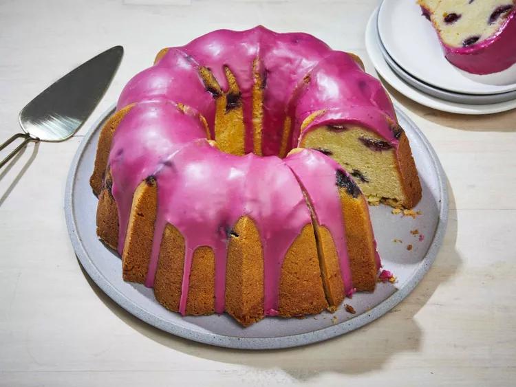 Stir together powdered sugar, lemon juice, and 2 tablespoons of the strained blueberry juice in a medium bowl, adding additional blueberry juice 1 tablespoon at a time until desired consistency is reached. Spoon Glaze over cooled Cake. Let stand until Glaze is set, about 30 minutes.