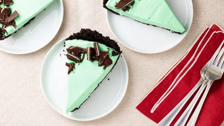 Before serving, combine the chocolate chips and vegetable oil in a small, microwave-safe bowl. Microwave at 50% power for 45 seconds. Stir several times to melt, then if needed, return to the microwave for 10 seconds more. Spoon the melted chocolate around the edge of the pie, then sprinkle the mint candy pieces on top. Keep chilled until ready to serve.