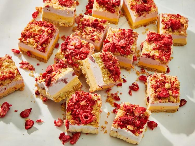 Roughly chop reserved 4 cookies; sprinkle evenly over strawberry ice cream layer. Roughly chop freeze-dried strawberries; sprinkle evenly over cookie crumble layer. Transfer to freezer; freeze until solid, about 8 hours.