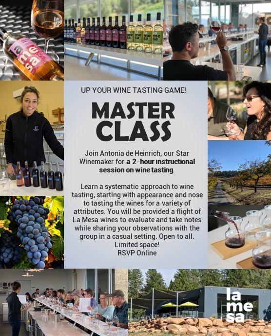The event will be seated inside our comfortable tasting room. You will learn a systematic approach to wine tasting starting with appearance and nose to tasting the wines for a variety of attributes. You will be provided a sample flight of La Mesa wines and a tasting sheet to use to evaluate the wines and to take notes before sharing your observations with the group. In this discussion, Antonia will illustrate the differences in each of the wines, how to describe the wine’s entry, mid palate and finish, what it means for a wine to be balanced, have weight, acid and structure. By the end of this class, your confidence and knowledge about wine should be greatly enhanced.