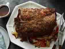 After 40 minutes, reduce heat to 275 degrees F and continue to roast for approximately 2 hours, or until internal temperature (stay away from the bone while checking temp) reaches 135 degrees F. Remove from oven, remove from roasting pan, loosely tent and allow to rest for 15 minutes while making the au jus.