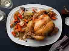 Roast the chicken for 1 1/2 hours, or until the juices run clear when you cut between a leg and thigh. Remove the chicken and vegetables to a platter and cover with aluminum foil for about 20 minutes. Slice the chicken onto a platter and serve it with the vegetables.
