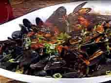 Remove the pot from the heat and transfer the mussels gently from the pot to a large bowl with a Chinese wire mesh skimmer. Return the pot to the heat and increase the heat to high. Boil for a minute or 2, until the sauce is thick enough to coat a spoon. Pour the sauce over the mussels and serve immediately.