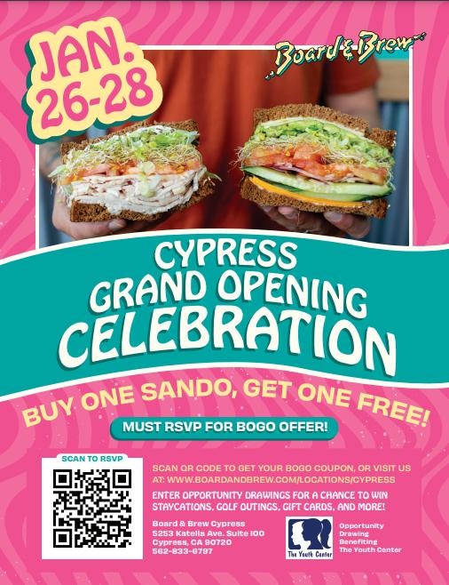 Board & Brew Specialty Sandwiches, renowned for its commitment to quality sandwiches and community engagement, is thrilled to announce the grand opening of its 28th store at 5253 Katella Ave, Ste 100, Cypress, CA 90720.