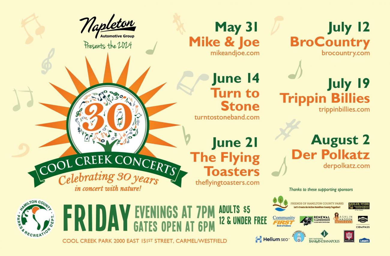 Cool Creek Concerts in concert with nature on select Fridays, June through August! Gates open at 6pm and show starts at 7pm! All kid zone activities, food and drink vendors will be available at all concerts. Outside food and drinks are allowed as well. Don’t forget to bring your lawn chair and/or blankets!