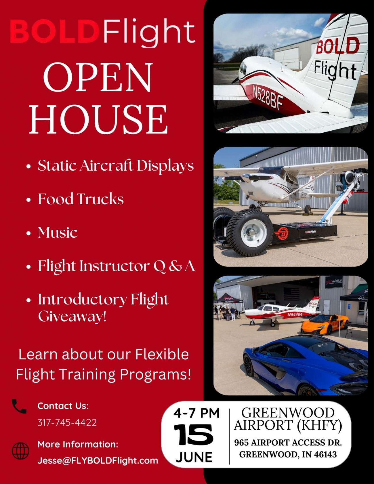 Join Bold Flight for an open house and fly-in. All are welcome. No entry fees. Helicopter rides will be available for $40. There will be food trucks, music, games, airplanes on display, giveaways, a noon flyover, and supercars on display.