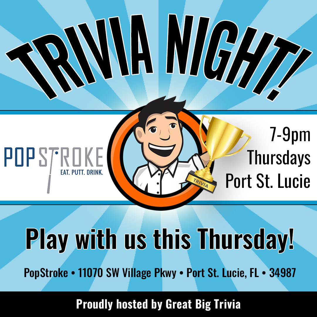 Get ready for a thrilling night of trivia at PopStroke in Port St. Lucie! Join us every Thursday from 7 to 9 PM for a fun-filled evening of brain teasers and friendly competition. Test your knowledge, laugh with friends, and enjoy the lively atmosphere of their state-of-the-art gastropub.