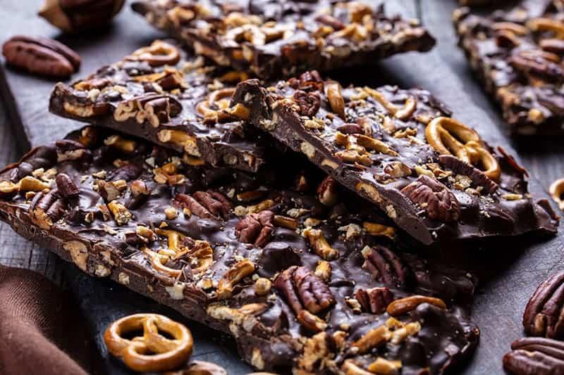 Once the chocolate is smooth, add in the pecans, pretzels and caramels. If you want prettier bark, reserve a little of the pretzels to sprinkle on the top.