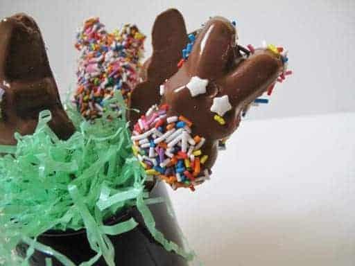 Melt your chocolate in the microwave in short bursts, 30 seconds each, stirring between each. When it’s completely smooth, dip the bunnies into the chocolate, letting the excess drip off.