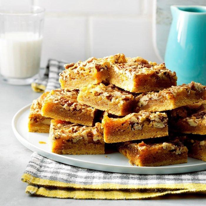 For filling, beat corn syrup, brown sugar, vanilla and reserved cake mix until blended. Add eggs; beat on low speed just until combined. Pour over warm crust; sprinkle with pecans.
