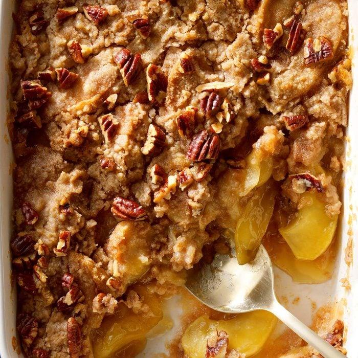 Preheat oven to 350°. Toss apples with sugars and fruit juices; spread into a greased 11x7-in. baking dish.