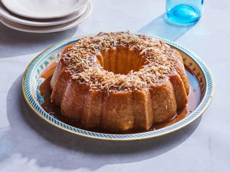 Turn the flan out onto a platter. Sprinkle with toasted coconut and serve.